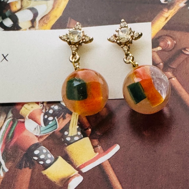オレンジ、グリーン、オーロラが透明樹脂に閉じ込められた 様子が美しいボールをキラキラピアス金具にぶら下げました 日常使いにおすすめです -----~-----~-----~-----~----- material:サージカルステンレス(ピアス金具),樹脂 size:縦約2.3cm(ピアス穴より) -----~-----~-----~-----~-----