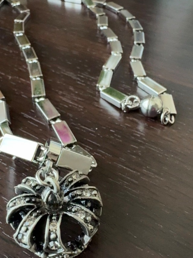 洗練された美しさの【鏡面仕上げチェーンネックレス/王冠】 このネックレスは、鏡面仕上げのチェーンに王冠モチーフが施された美しくエレガントなデザインです。 王冠のチャームは、ステンレス製の高級クリッカーで取り外しも可能。 *王冠には自身やエネルギーといった意味合いもございます^ ^ どんなコーディネートにも合わせやすく、日常から特別な日まで幅広く活躍します。 さらに、シンプルなデザインながらも、洗練された印象を与えるので、重ね付けにもぴったりです。 こちらのチェーンは90年代のデッドストック ヴィンテージチェーンをリメイクしたものです。ステンレス製のマグネットに変えることで 着脱も楽ちん。 長さがありますので首からスポッとかぶれます。 <コンディション:S> 当店ではセレクトヴィンテージ品を扱っている為、 商品の状態を4ランク付けしております。ご購入前にご確認下さい。 <コンディションランク> S 新品・未使用品(デッドストック) A 使用感やダメージがほぼ無い B 多少の使用感がある C 使用感があり、多少のダメージがある *チャーム、マグネットは現代ものです* -----~-----~-----~-----~----- material: 合金 size: 全長約72cm(王冠部分縦約3.5cm) -----~-----~-----~-----~-----
