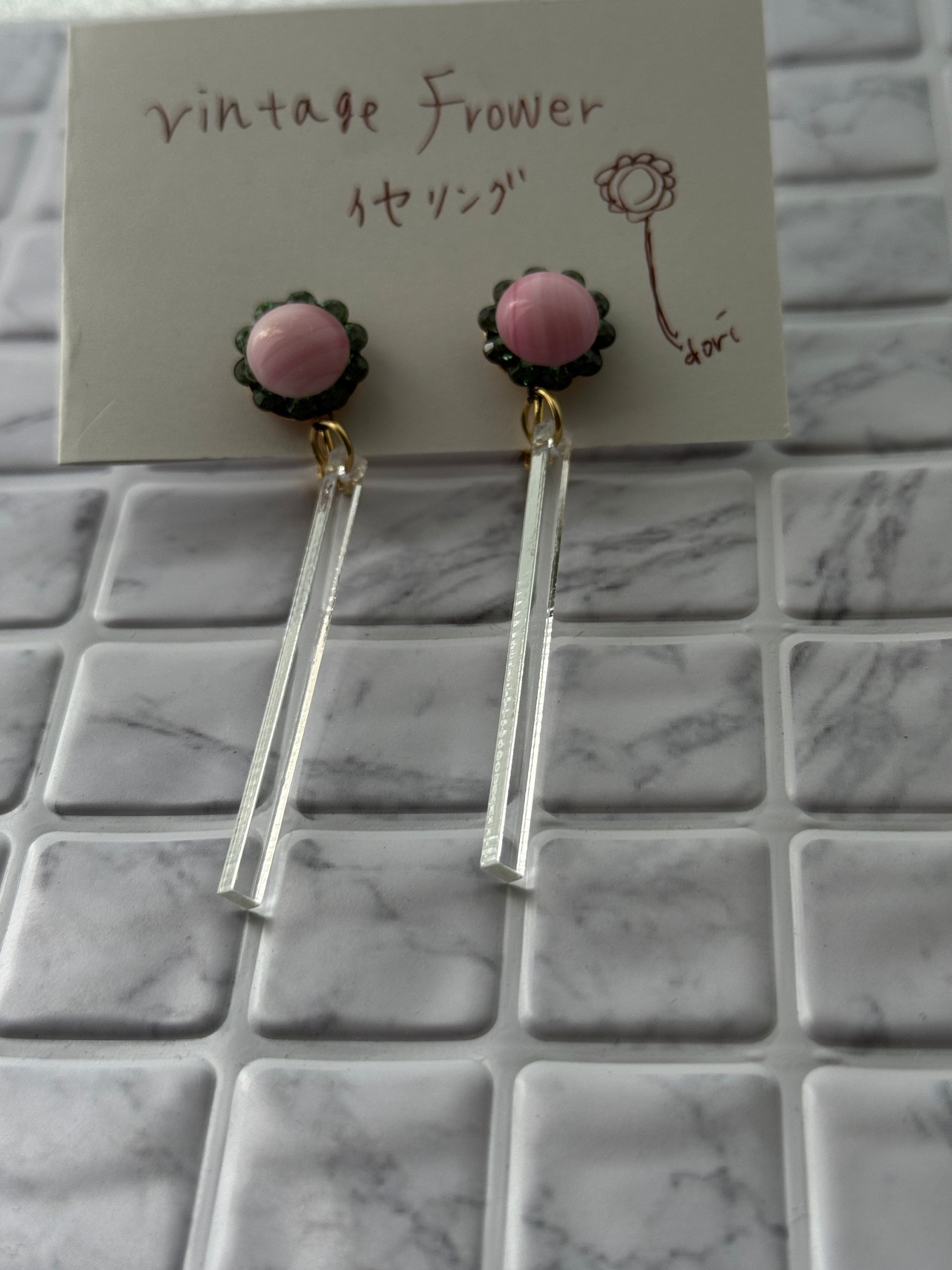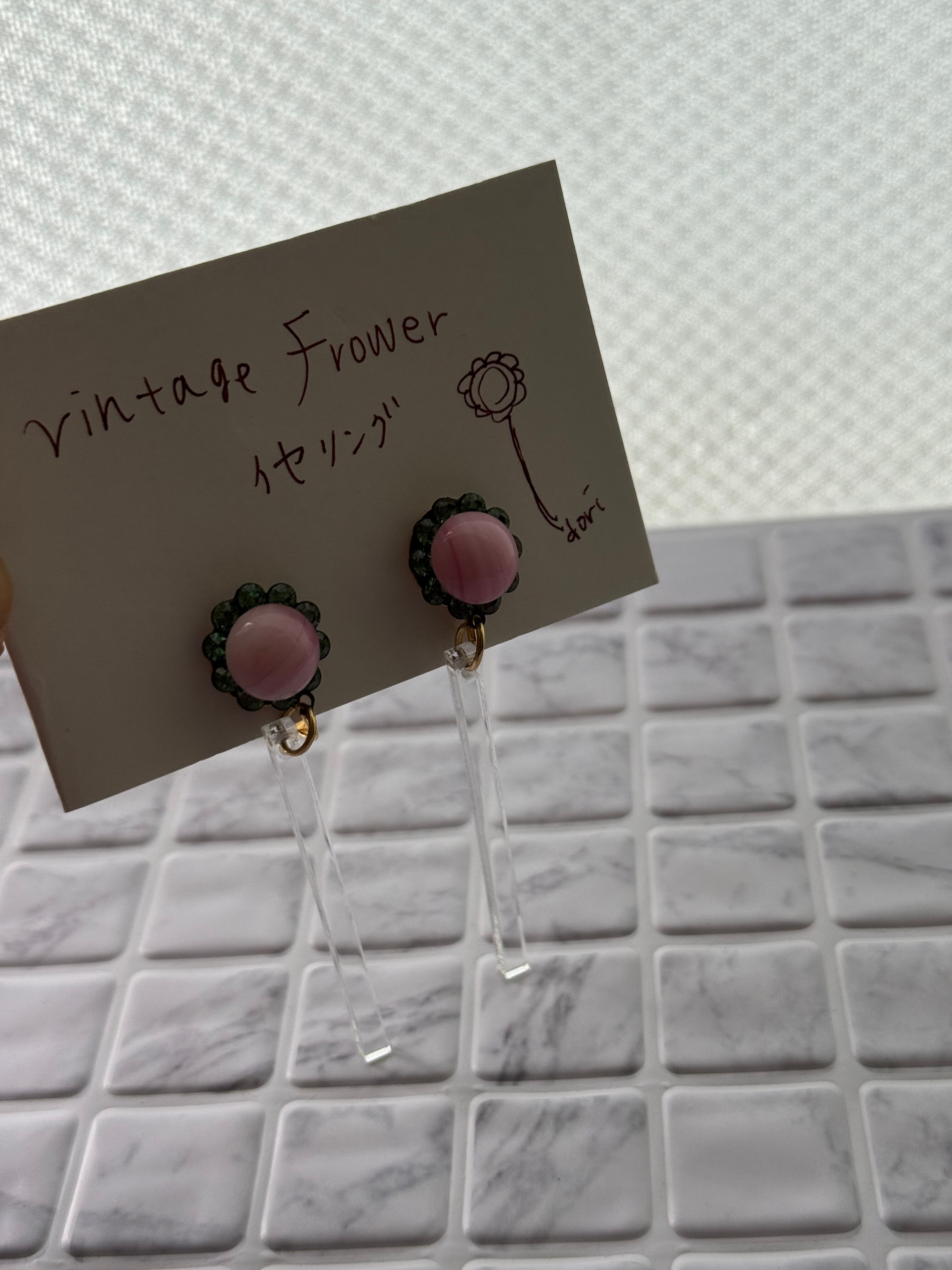 ヴィンテージのマーブル模様が美しいガラスとリング型ラインストーンが花モチーフになった