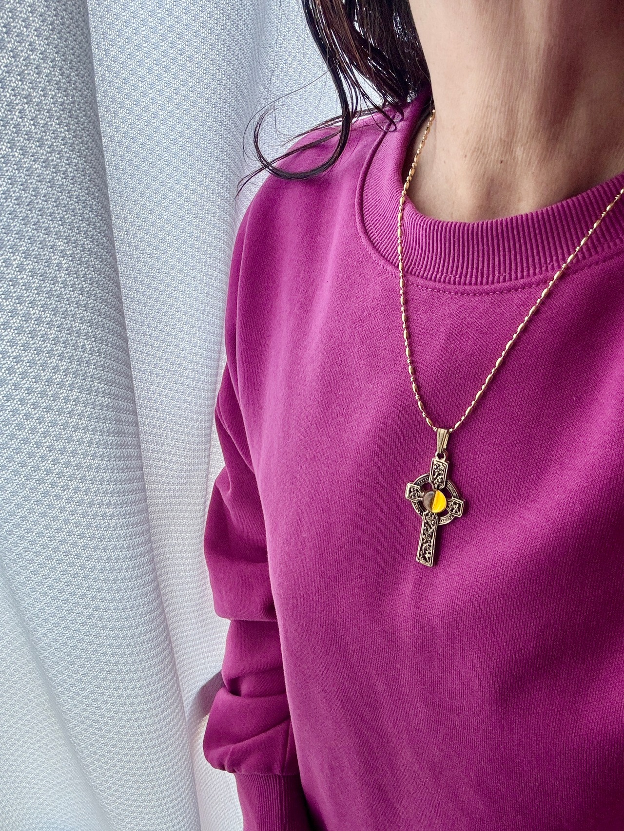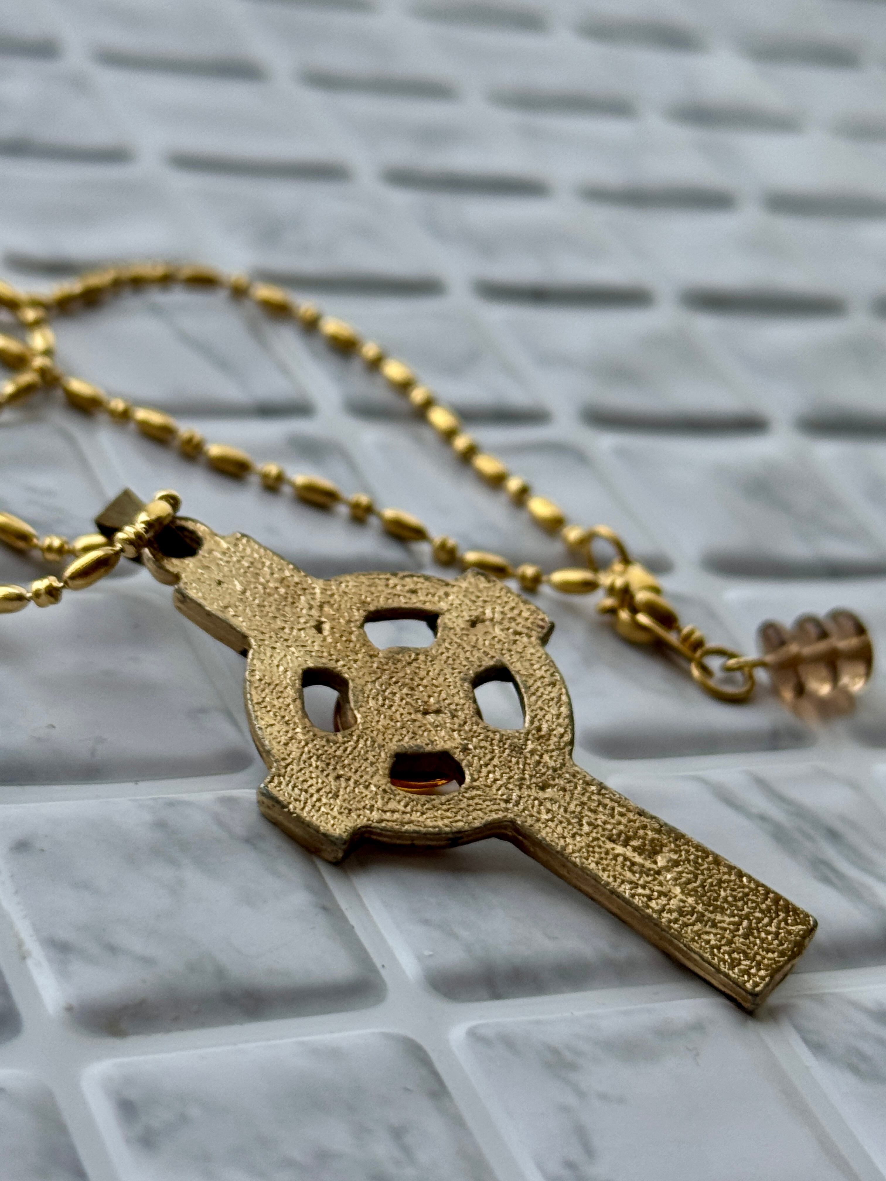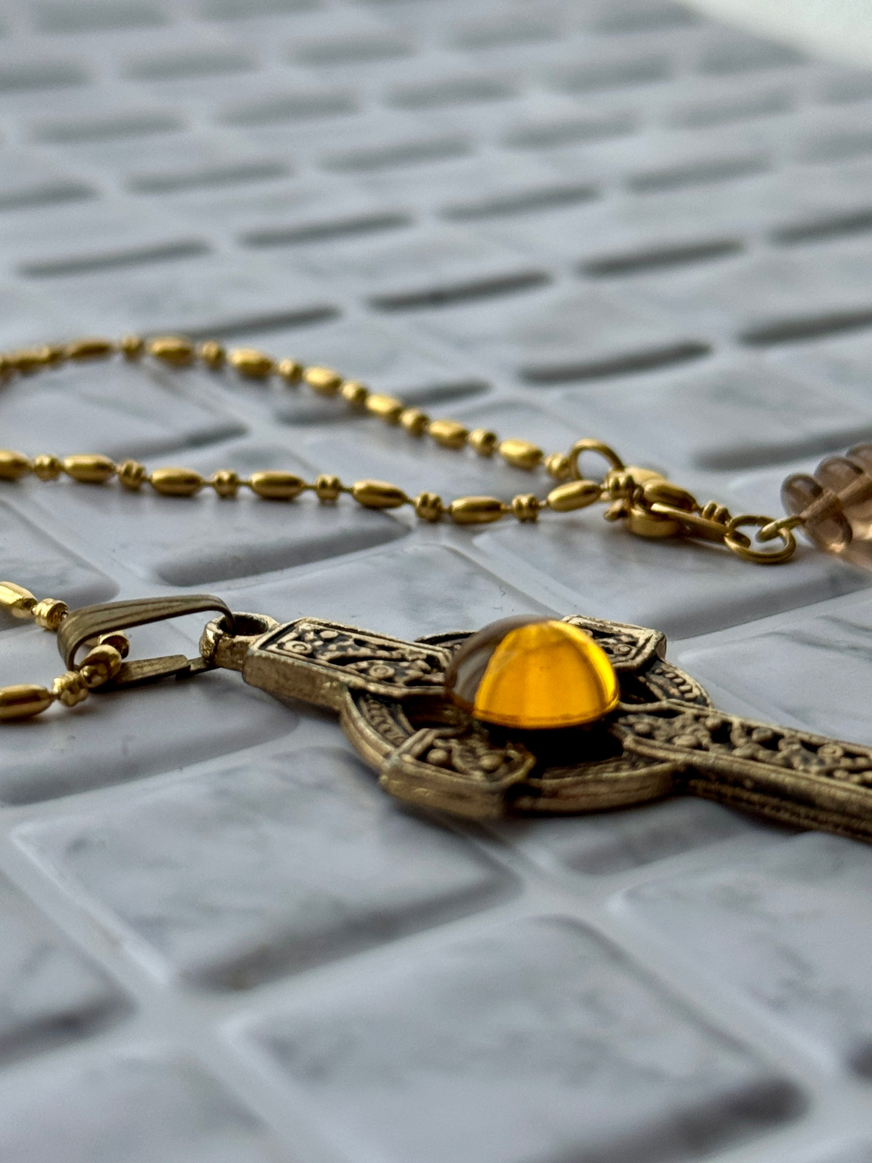ケルト紋様が美しく施されたクロスネックレ!山吹色のガラスビーズも真鍮色の金具に映え美しいです。