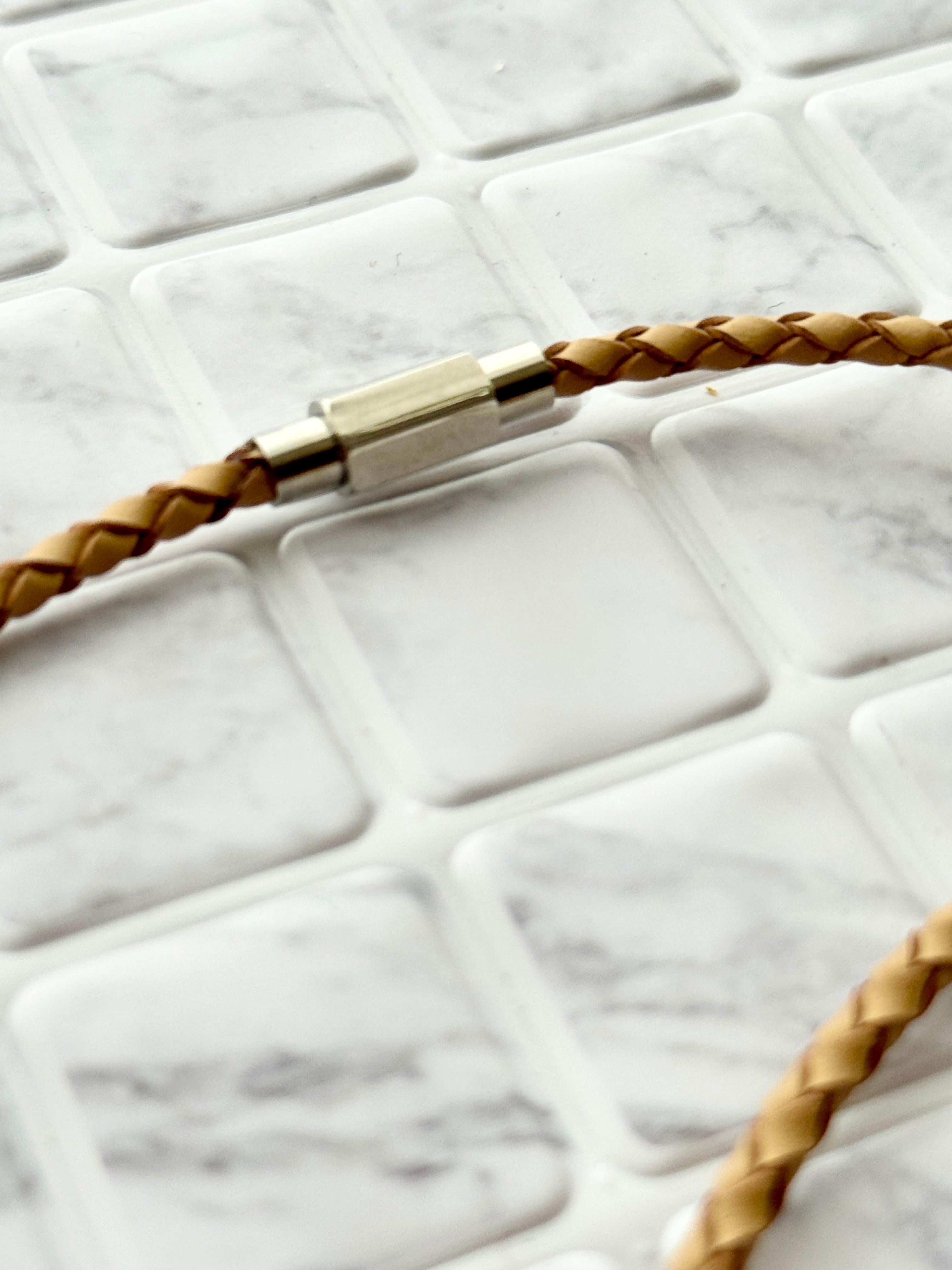 こちらの四編みレザーコードは六角形が美しいマグネットタイプで着脱も楽ちんです