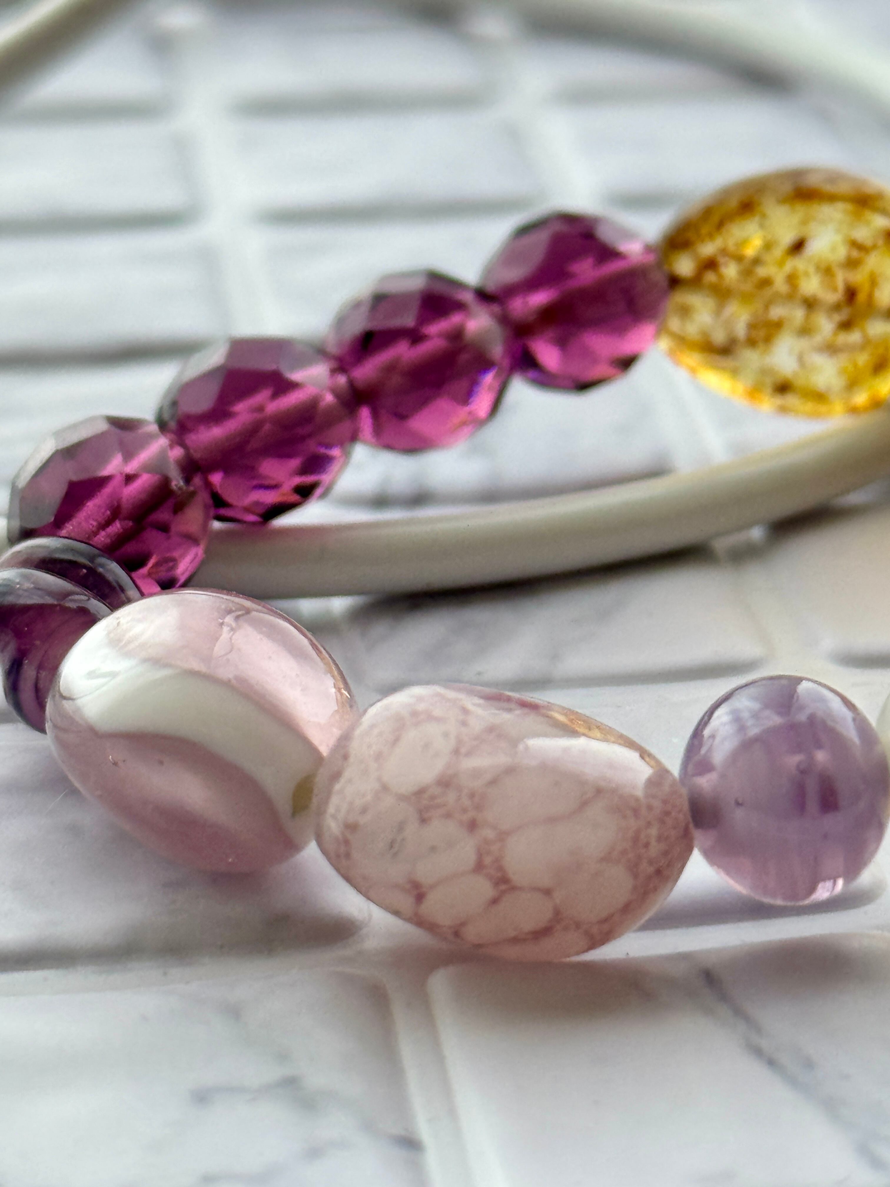 ゴムブレスのため着け心地が良く、日常使いから特別なシーンまで幅広くご利用いただけるアイテムです。パープルとピンクの絶妙な組み合わせが、どんなスタイルにも華やかさをプラスします。