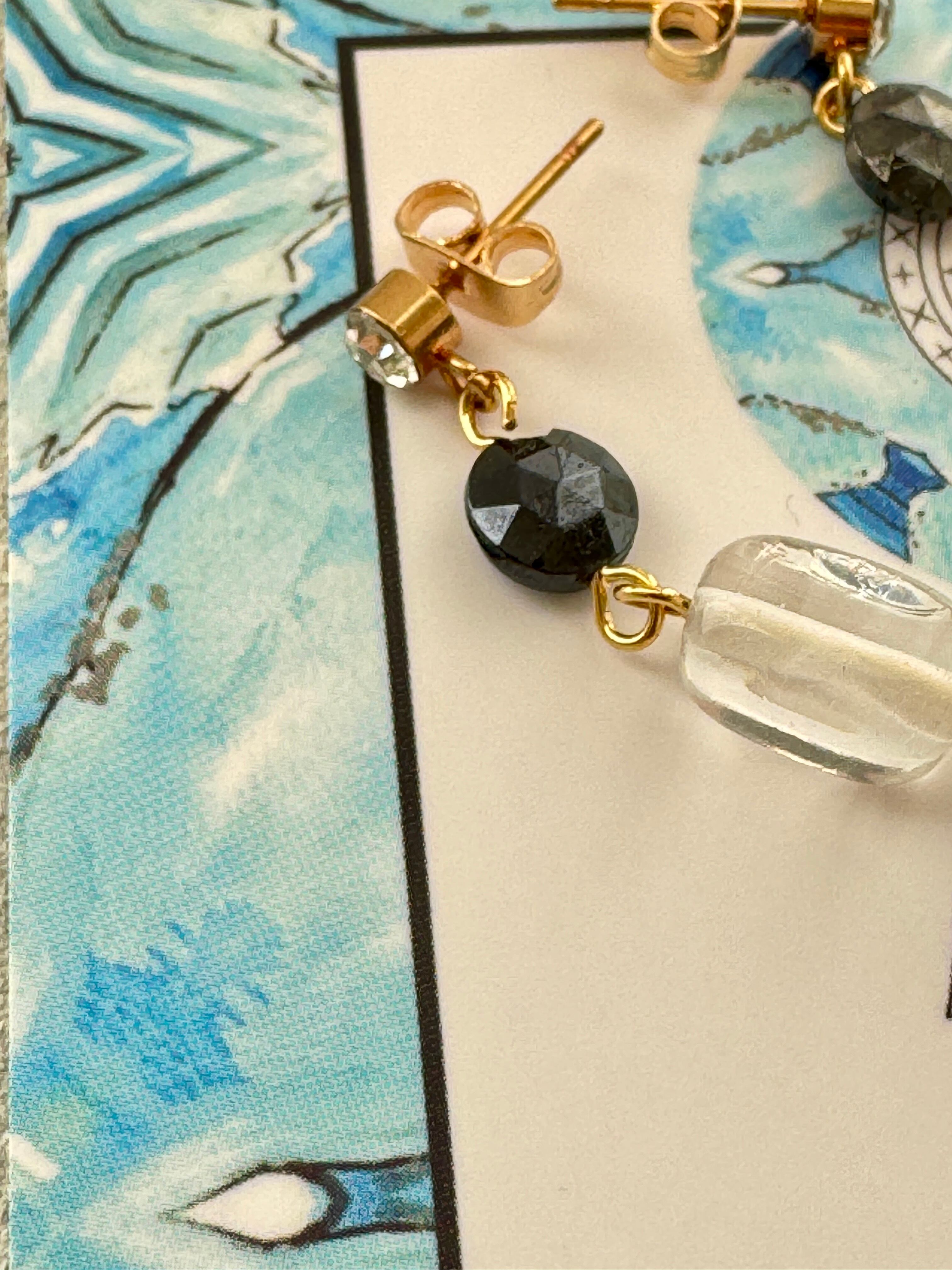このピアスは、ブラックのアンティークガラスと繊細なガラスビーズが一つ一つ丁寧に並べられたデザインが魅力的なピアスです。