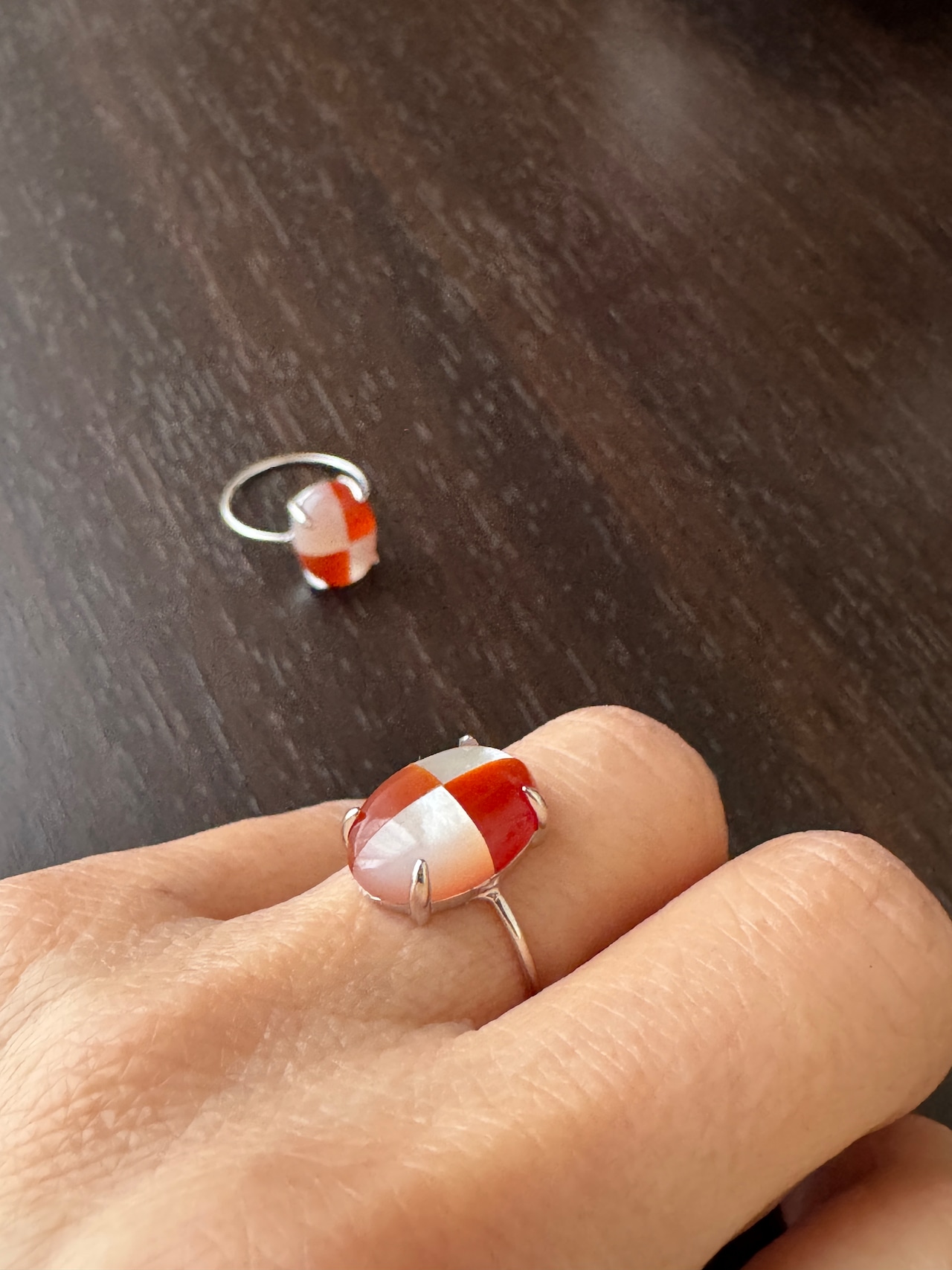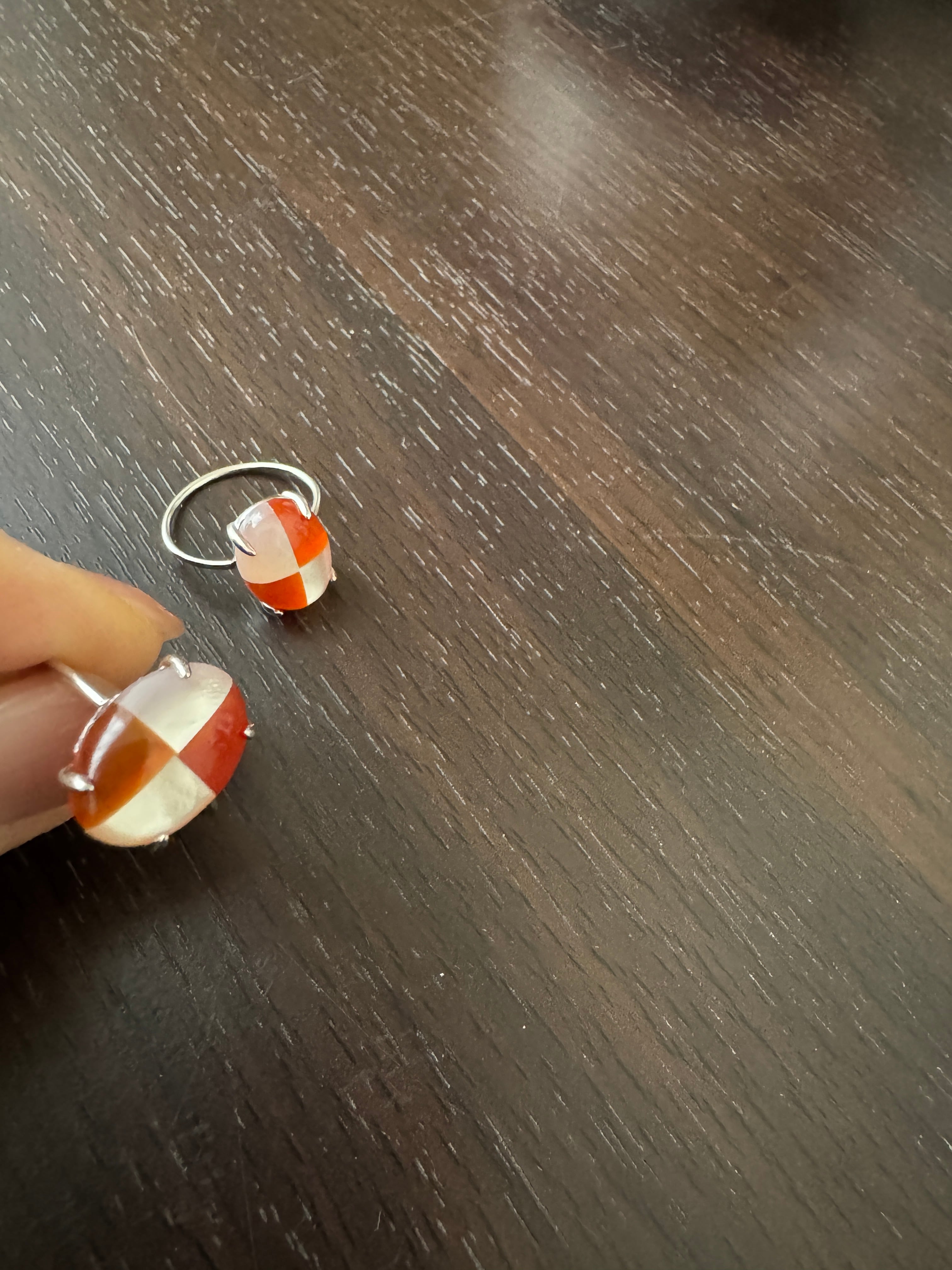 このリングは、魅力的な紅白のツートンカラーが絶妙に組み合わさったデザインが特徴です。色のコントラストが指先を華やかに彩り、どんなシーンでも目を引く存在感を放ちます♪